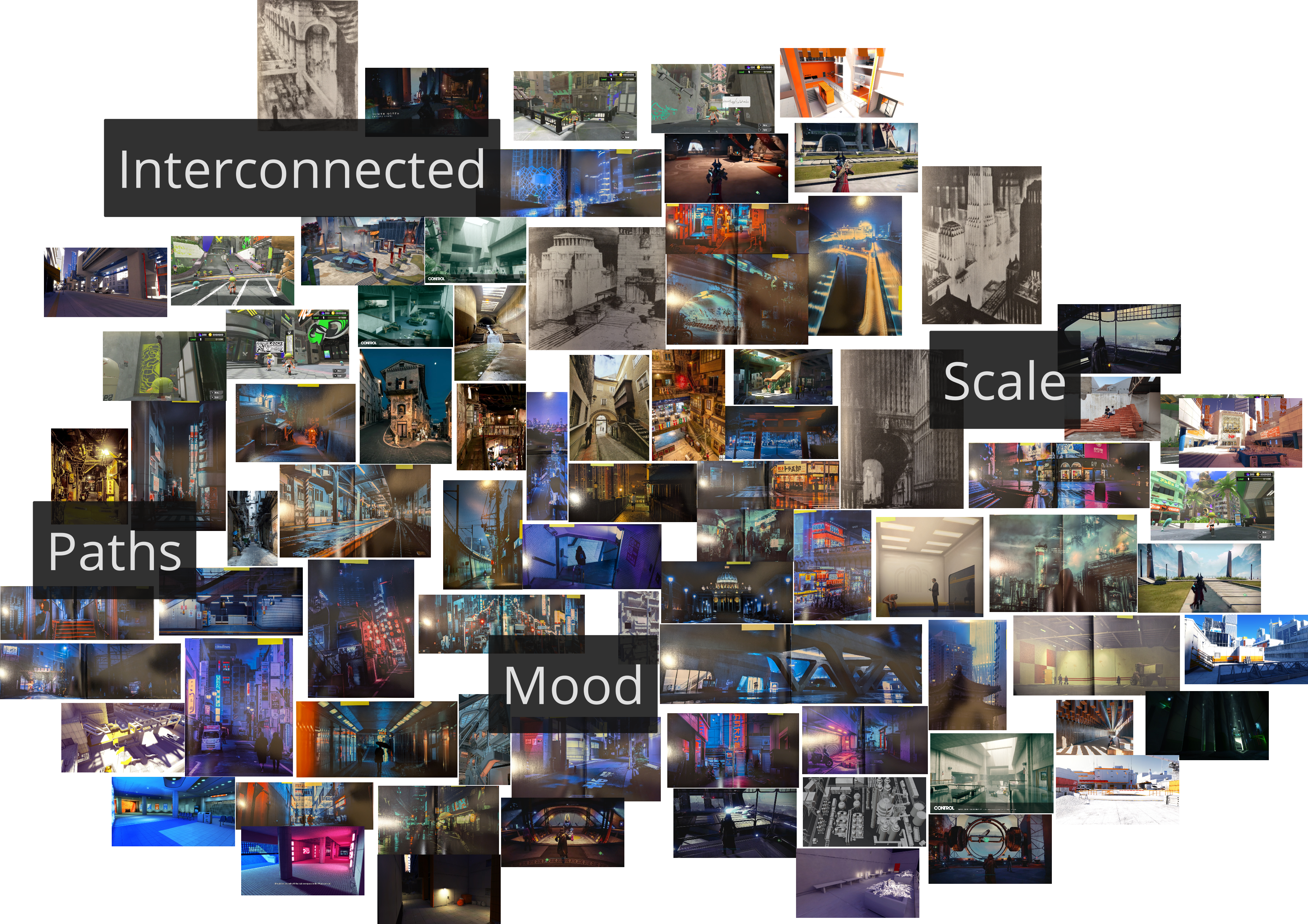 My primary focus in this project was level design, specifically, my goal was to create levels that would uphold the pillars while enticing players to be mischievous and create space for emerging narratives to grow from player behaviour. Using the style and theme established by the group, I gathered a collection of inspiration images into a PureRef file, including from games like Splatoon and photographers such as Liam Wong, focusing on architecture and urban environments. Using keywords related to our level design goals, I organised the inspiration images into a cloud where position to each keyword corresponded to the image’s relevance to it. This organisation significantly helped during level prototyping as I compared my progress to the keywords and drew inspiration from the specific areas that I needed to work on.