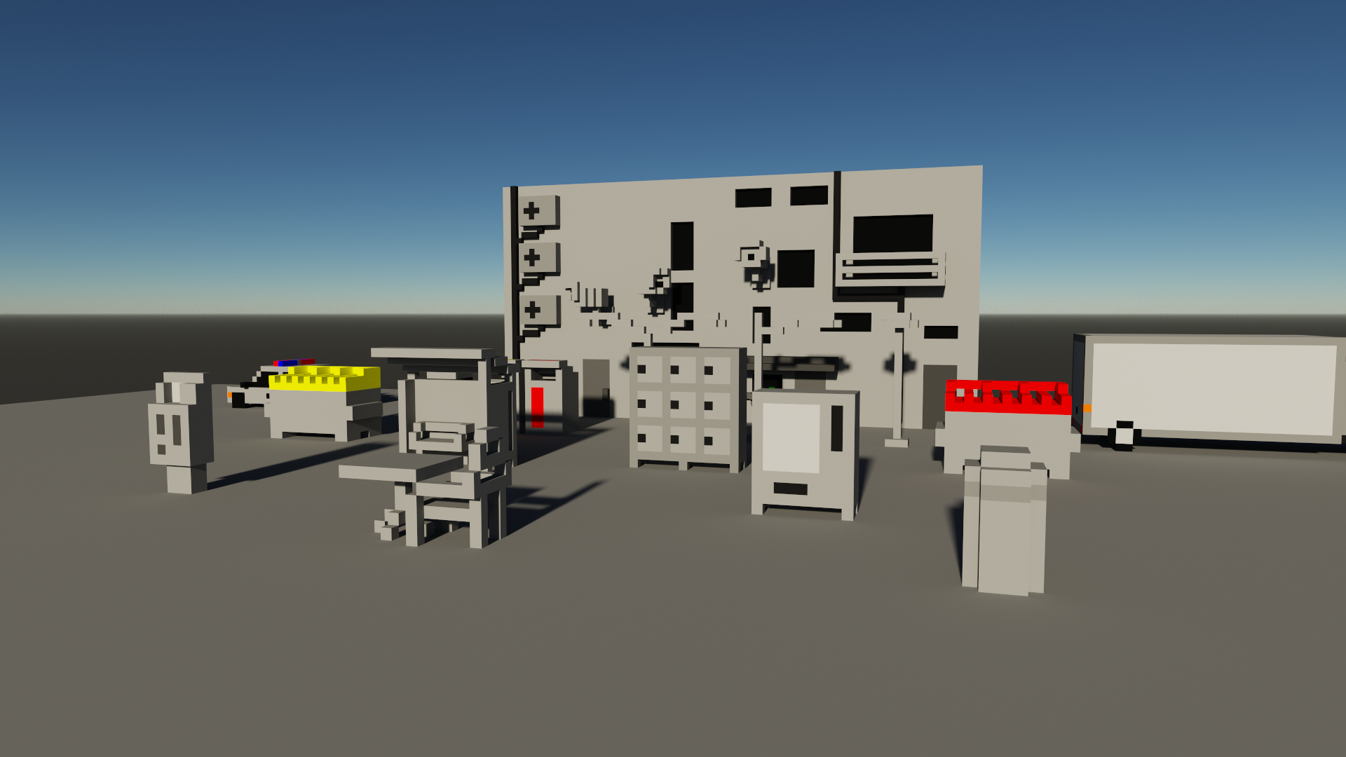 With the environments made, we brainstormed a list of props to populate them. These would be used to encourage mischief and establish a sense of life in the level. My goal was to make props which I thought would be enticing to spray in the game. This focus was on objects which can often be seen in real life with graffiti, such as lockers and bus stops, but also objects with large, flat, dull surfaces, begging for a pop of colour, like a box truck. I also made objects that would make players feel like they were being watched, like police cars and security cameras, to reinforce that feeling of causing trouble. My final set of props was a series of building facades that could be used to enclose the map, stopping the player from getting out of bounds.