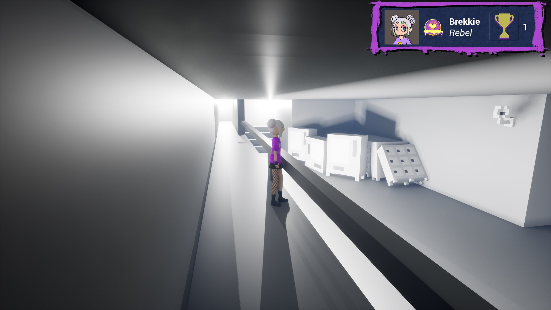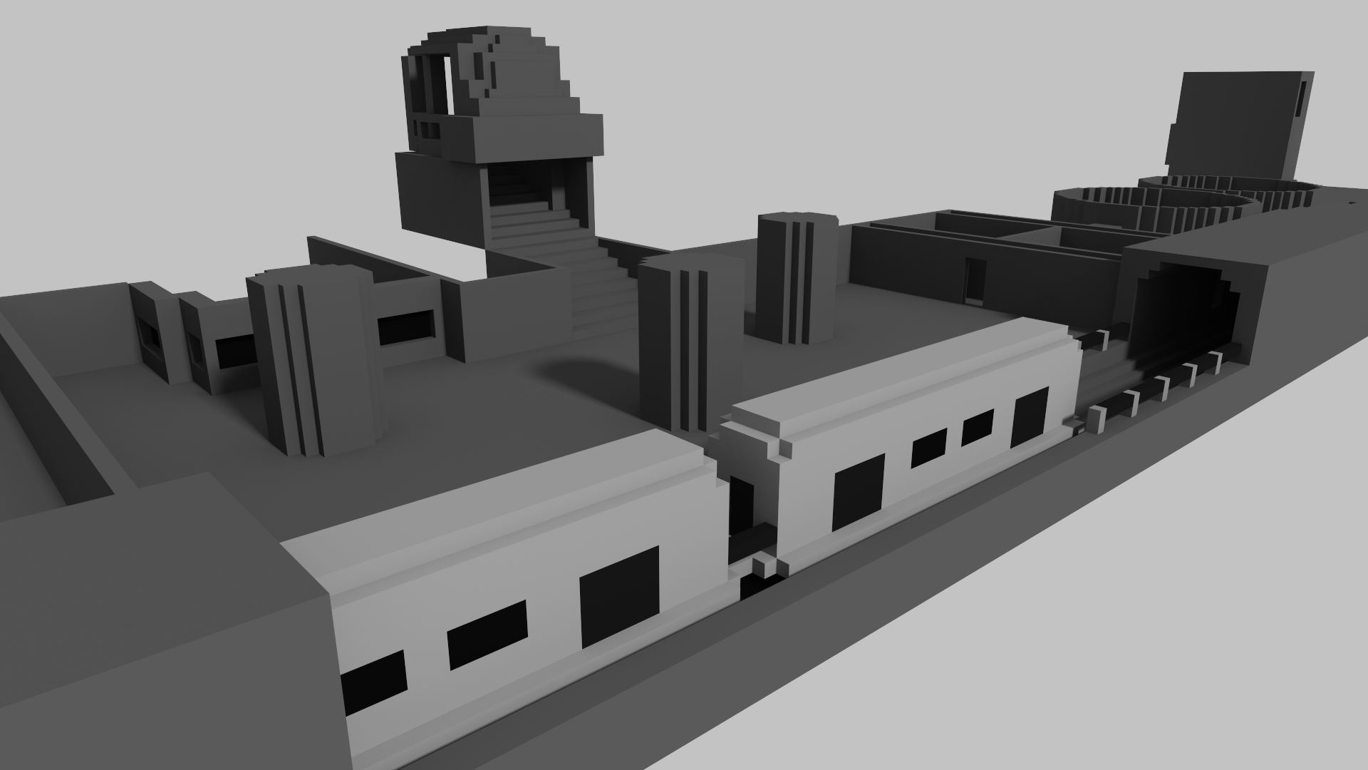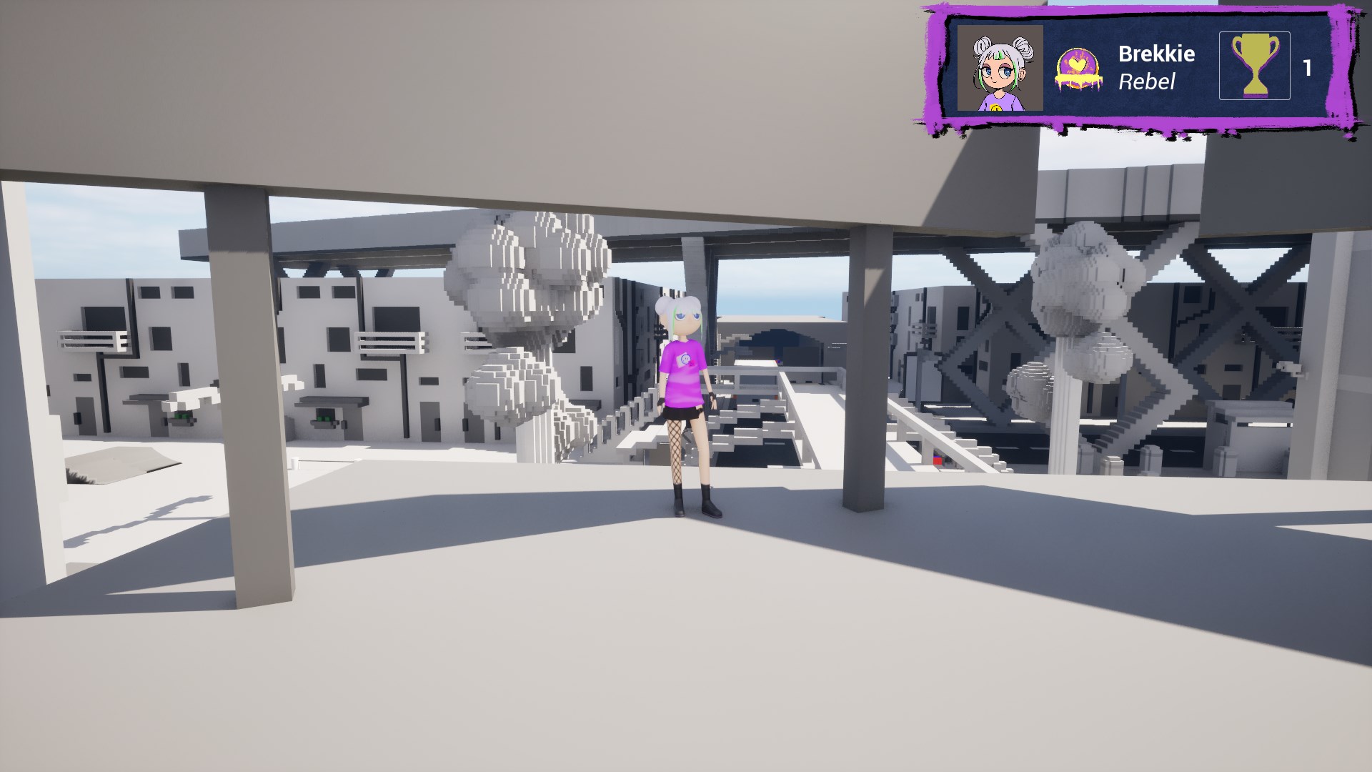 I chose to create two levels/areas for the game, an underground metro, and a skatepark with surrounding alleys. I chose these locations as they afforded the inclusion of spaces that people are usually not allowed to go, such as into maintenance areas, offering players a chance to break the rules. They also represent urban gathering points where communities have the potential to form, encouraging the sharing and celebration of art. While building these levels, I thought about what I could include that would be interesting to spray or explore, drawing from the gathered inspiration and my personal experience in urban photography. These levels were created using the voxel design tool MagicaVoxel, for its ease of use and strengths in rapid prototyping. To reinforce the main mechanic of spraying art onto every surface, we decided to limit the colour palette to neutral grey tones, so that sprays would pop. I also tried to include large, flat surfaces where I could to create high-quality canvases for the art.