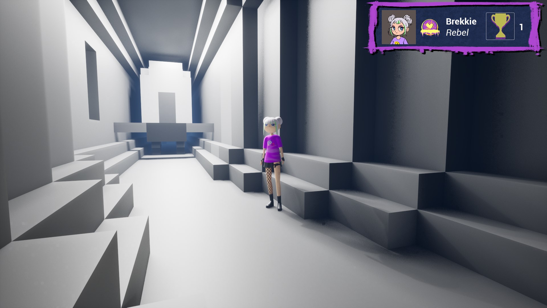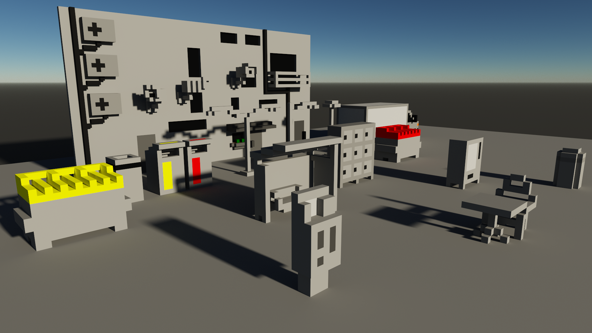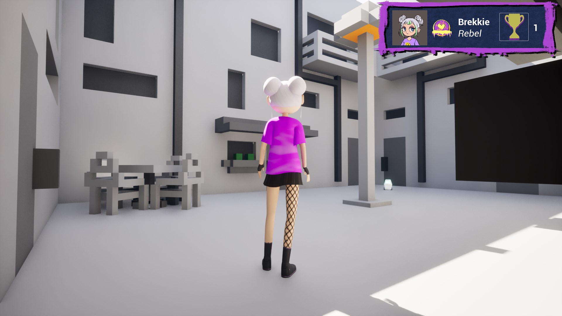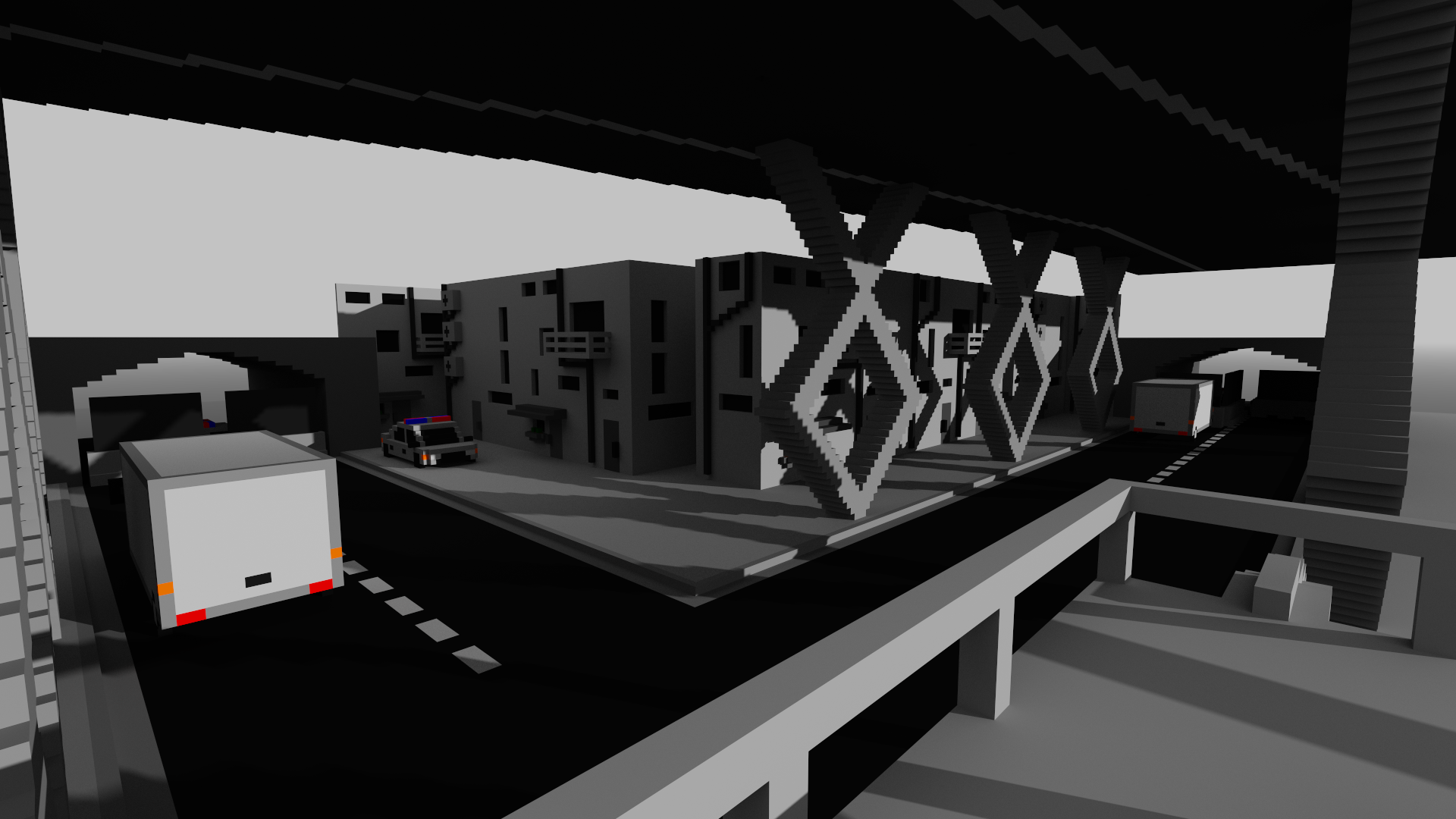 I chose to create two levels/areas for the game, an underground metro, and a skatepark with surrounding alleys. I chose these locations as they afforded the inclusion of spaces that people are usually not allowed to go, such as into maintenance areas, offering players a chance to break the rules. They also represent urban gathering points where communities have the potential to form, encouraging the sharing and celebration of art. While building these levels, I thought about what I could include that would be interesting to spray or explore, drawing from the gathered inspiration and my personal experience in urban photography. These levels were created using the voxel design tool MagicaVoxel, for its ease of use and strengths in rapid prototyping. To reinforce the main mechanic of spraying art onto every surface, we decided to limit the colour palette to neutral grey tones, so that sprays would pop. I also tried to include large, flat surfaces where I could to create high-quality canvases for the art.
